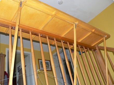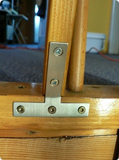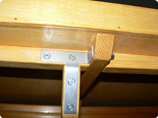 Die Platte wird oben auf dem Geländer mit 6 M6 Senkkopfschrauben gehalten, die durch das Geländer hindurchgehen und unten mit M6 Hutmuttern gegengehalten werden. Allein dies wäre für Büroarbeiten bereits stabil genug. Durch die 3 Streben wird das Ganze deutlich stabiler, sodass man alles, was man im Haus normalerweise herumträgt, darauf ablegen kann.