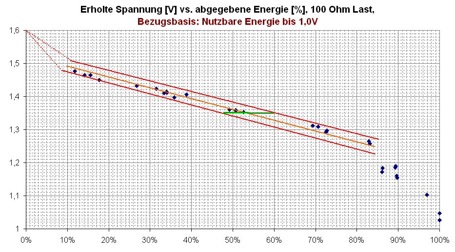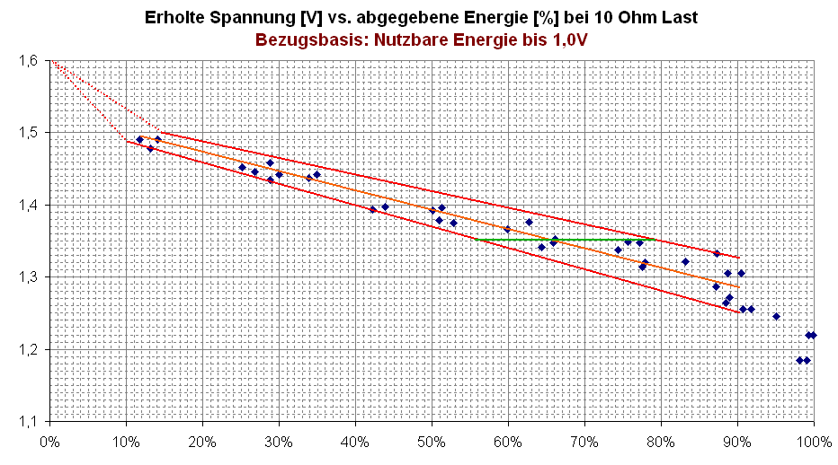 01. Einleitung 02. Wesentliche Ergebnisse im Überblick 03. Energieinhalt von Batterien 04. Nutzbarer Energieanteil 05. Ladezustand vs. Ruhespannung: Theorie 06. Ladezustand vs. Ruhespannung: Diagramme 07. Ladezustand vs. Ruhespannung: Tabellen 08. Spannungsverlauf vs. Zeit: Einleitung 09. Spannungsverlauf vs. Zeit: Alkali, 100 Ohm 10. Spannungsverlauf vs. Zeit: Alkali, 10 Ohm 11. Spannungsverlauf vs. Zeit: Zink, 100 Ohm 12. Spannungsverlauf vs. Zeit: Zink, 10 Ohm 13. Überblickseite über alle Einzeltests 14. Vergleichende Bewertung: Rangfolgen 15. Vergleichende Bewertung: Energieinhalte 16. Exemplarstreuungen: Beispiele | Im Folgenden werden 4 Fälle unterschieden und graphisch dargestellt: