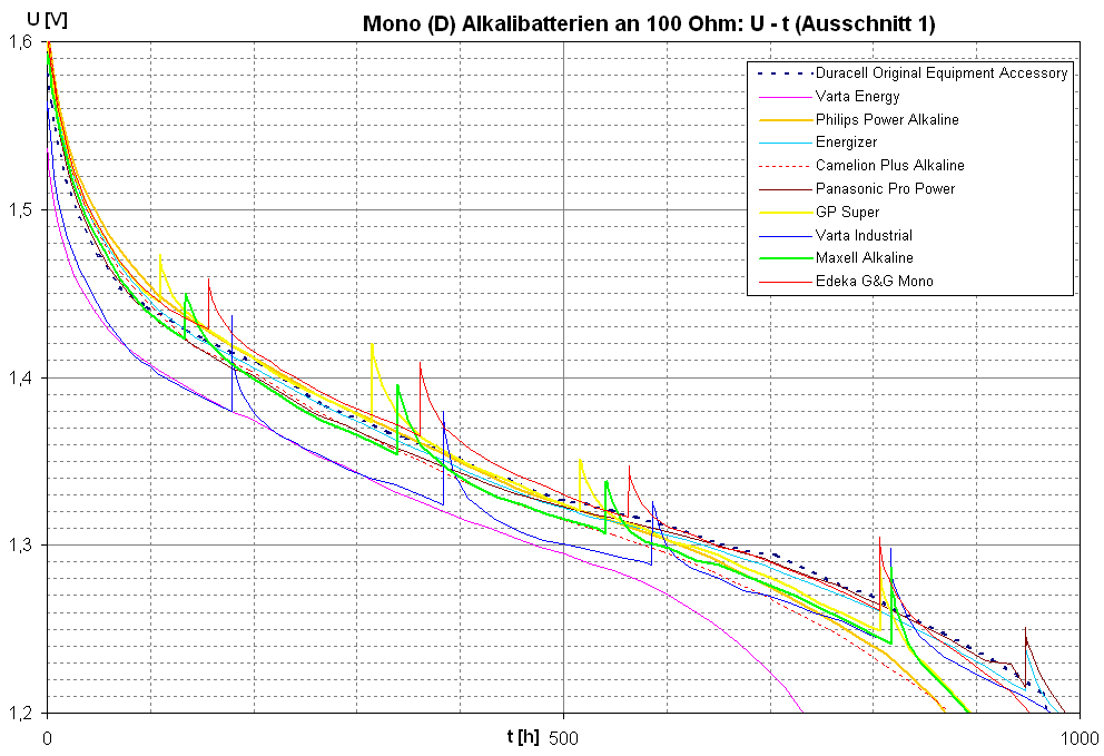 | Inhaltsverzeichnis  01. Einleitung 02. Wesentliche Ergebnisse im Überblick 03. Energieinhalt von Batterien 04. Nutzbarer Energieanteil 05. Ladezustand vs. Ruhespannung: Theorie 06. Ladezustand vs. Ruhespannung: Diagramme 07. Ladezustand vs. Ruhespannung: Tabellen 08. Spannungsverlauf vs. Zeit: Einleitung 09. Spannungsverlauf vs. Zeit: Alkali, 100 Ohm 10. Spannungsverlauf vs. Zeit: Alkali, 10 Ohm 11. Spannungsverlauf vs. Zeit: Zink, 100 Ohm 12. Spannungsverlauf vs. Zeit: Zink, 10 Ohm 13. Überblickseite über alle Einzeltests 14. Vergleichende Bewertung: Rangfolgen 15. Vergleichende Bewertung: Energieinhalte 16. Exemplarstreuungen: Beispiele | Hier