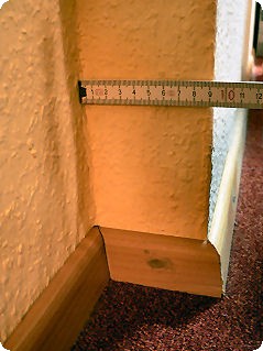 Die Wand der Gaube steht wie weiter oben erwähnt an der Kniestockmauer direkt auf dem Boden. Dies hat einen geringfügigen Raumverlust zur Folge, wie im Bild rechts zu erkennen ist. Die Holzkonstruktion mit der darauf montierten Gipskartonplatte weist eine Dicke von ca. 9 cm auf. Links vorne im Bild ist die originale gemauerte Wand. |