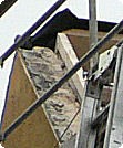 Kleines Bild: Hier ist der oberste Bereich einer Giebelwand zu sehen. Links die Oberkante der Hauswand, erkennbar an der bröckeligen Struktur. Unmittelbar rechts daneben, helles Holz, der erste Aufdopplungsbalken |