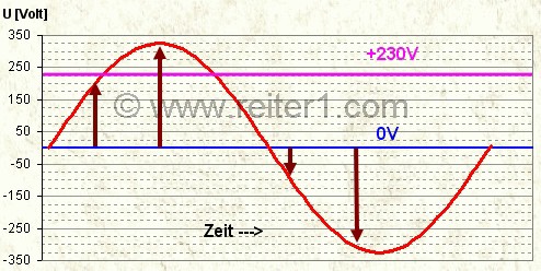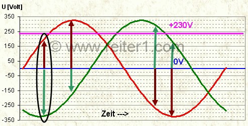 Kurve hat den Wert Null Volt. Die drei Spannungswerte addieren sich