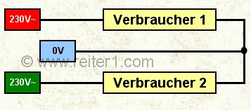 Nun werden 2 von den 3 230V Leitern mit Verbrauchern beaufschlagt. Beide Verbraucher liegen zwischen 230V und 0V.