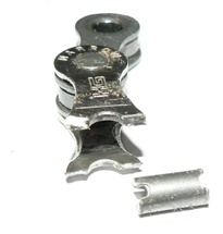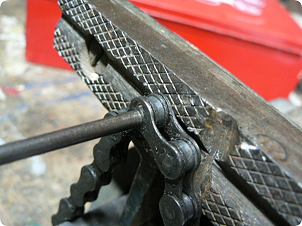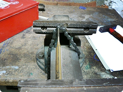 Kettenniete mittels Schraubstock und Durchschläger herausdrücken. Man