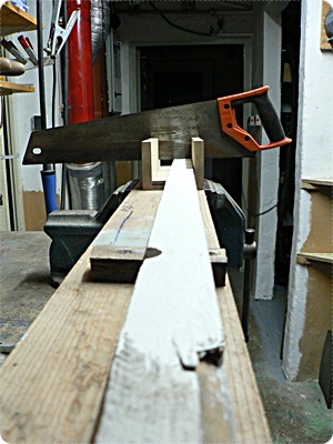 Eine Schneidlade (Baumarkt) wird auf ein Brett geschraubt und das ganze zusammen in einen Schraubstock gespannt. Damit die zu zersägende Latte absolut eben aufliegt, wird auf das Brett an geeigneter Stelle ein zusätzliches Stück Holz aufgeschraubt, welches die selbe Dicke hat wie die Schneidlade.