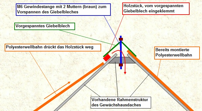 Das wesentliche an der geschilderten Vorgehensweise ist, dass die Holzstücke zunächst Platz schaffen, um die Wellbahn unter die Giebelbleche zu schieben, um dann durch ihr Fehlen (fallen ins Gewächshaus hinein) infolge der Vorspannung der Giebelbleche die Wellbahn in Position zu halten.