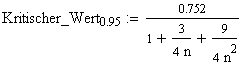 Standardabweichung bekannt, gilt Kritischer_Wert0,95 = 0,752. Wenn sowohl Mittelwert als auch Standardabweichung als unbekannt vorausgesetzt werden, also aus den Messdaten geschätzt werden müssen, dann gilt Hinweis: Anstelle den kritischen Wert umzuskalieren kann man auch die Prüfgrösse A in A*umskalieren: A* = A(1+3/4n +9/4n2) Für Alpha = 10% bzw. 1% nimmt man statt 0,752 den Wert 0,631 bzw. 1,035. |