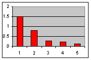 Die Eigenwerte von J, K und L lauten 1.5, 0.81, und 0.27. Die Eigenwerte zweier weiterer Faktoren seien 0.22 und 0.13. Damit ergibt sich folgender Scree-Plot: Dem Plot entnimmt man visuell, dass bereits der Faktor L eher dem "Rauschen" zuzuordnen ist, und man das Modell auf 2 Faktoren beschränken sollte. |