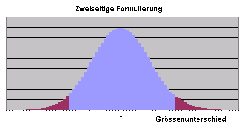 Wenn nun in Wirklichkeit Männer im Durchschnitt grösser wären als Frauen, dann wäre in dieser zweiseitigen Hypothesenformulierung das Erreichen von Signifikanz erschwert, weil die Grenzen zu den roten Teilbereichen weiter von Null weg liegen als die Grenze der Fläche im einseitigen, gerichteten Fall.