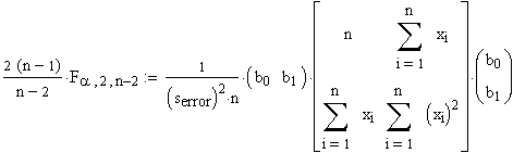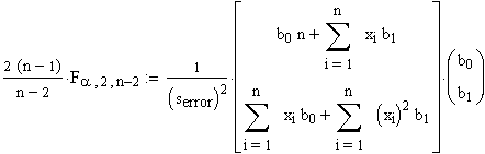 Dies ist eine quadratische Form aus 2 unabhängigen Variablen b0 und b1. Aus der linken Seite der Gleichung ergibt sich durch die Anzahl n der Messungen und dem festzulegenden a ein fester Zahlenwert. b0 und b1 sind nun so zu wählen, dass die Gleichung erfüllt ist. Die Lösungsmenge der b0 und b1 beschreibt eine Ellipse im zweidimensionalen Raum, aufgespannt durch b0 und b1. |