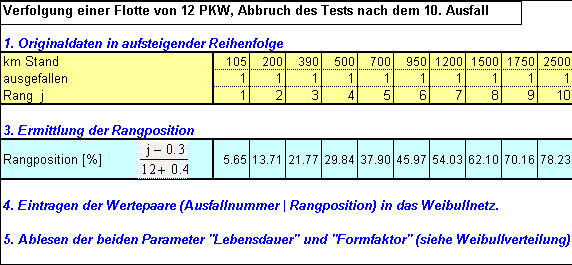 Die während der Tests angefallenen Lebensdauerdaten müssen vor der Eintragung in ein Weibullnetz mit Hilfe der folgenden Schritte aufbereitet werden.