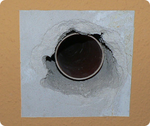 Innenseite aus Luftpolsterfolie rund um das Rohr ins Bohrloch gestopft.