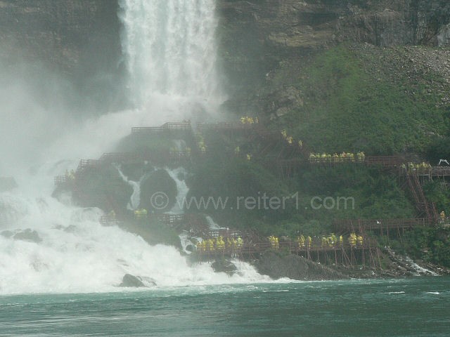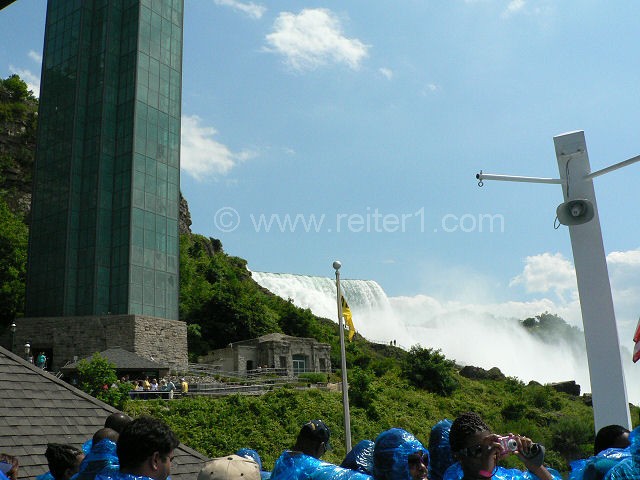 Die Anlegestelle der Maid of the Mist. Die Regenüberzüge sind wieder im Preis inbegriffen und diesmal blau.