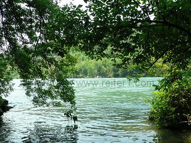 Das Robert Moses Wasserkraftwerk vom Fluss aus gesehen. Genau gegenüber, hinter der Kurve, befindet sich das Sir Adam Beck Wasserkraftwerk. Die Niagarafälle befinden sich ca. 7 km flussaufwärts. Beide Kraftwerke beziehen ihr Wasser durch Tunnel und Kanäle von oberhalb der Niagarafälle.