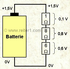 Die Widerstandswerte verhalten sich von unten nach oben wie 6:8:1, demnach verhalten sich auch die Spannungen wie 6:8:1, was bei 1,5V Gesamtspannung 0,6V : 0,8V : 0,1V entspricht. Die Vorzeichen sind hier nicht dabei, da nur die Spannungsabfälle (also die Beträge) gemeint sind. Würde man die Spannungen auf 0V beziehen, dann erhielte man folgende Werte: +0,6V, +1,4V und natürlich +1,5V, mit Vorzeichen, da nun ein Nullpunkt vorgegeben ist.