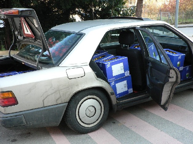 In einen W124 passen 40 Kartons = 600 Flaschen rein. Man geht einfach in einen Supermarkt an die Kundentheke und sagt, man wolle 600 Liter Salatöl kaufen. Das Personal bestellt dann und nach 2 Tagen kommt man wieder und bekommt die Palette auf den Parkplatz ans Auto herangefahren. | |
